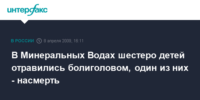 Москва. 8 апреля. INTERFAX.RU - В городе Минеральные Воды (Ставропольский край) шестеро детей в возрасте от 8 до 10 лет были госпитализированы в больницу с отравлением ядовитым растением - болиголовом. Один ребенок скончался.