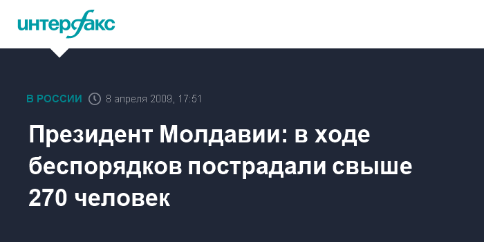 Москва. 8 апреля. INTERFAX.RU - Число пострадавших в ходе беспорядков, происшедших в Кишиневе в минувший вторник, составило более 270 человек, заявил президент Молдавии Владимир Воронин в среду на заседании правительства.