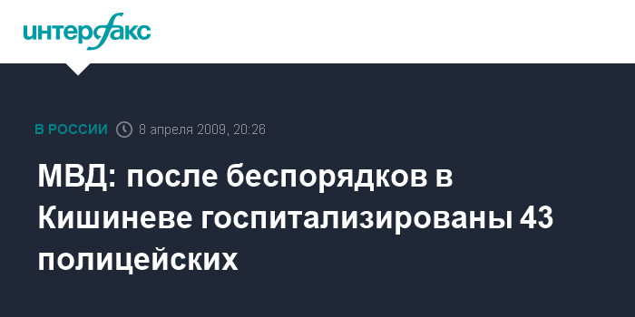 Кишинев. 8 апреля. INTERFAX.RU - Медицинская помощь понадобилась 118 полицейским, пострадавшим при беспорядках в Молдавии, 43 сотрудника правоохранительных органах госпитализированы.