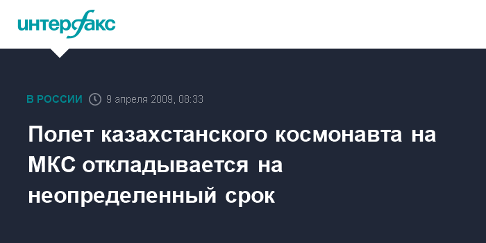 Москва. 9 апреля. INTERFAX.RU - Полет казахстанского космонавта в составе международного экипажа на Международную космическую станцию (МКС), планировавшийся на сентябрь текущего года, откладывается на неопределенное время из-за сокращения финансирования, сообщил глава национального космического агентства Казахстана (Казкосмос) Талгат Мусабаев.