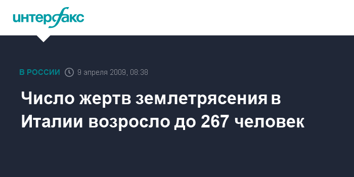 Москва. 9 апреля. INTERFAX.RU - В списке жертв землетрясения в итальянской области Абруццо уже 267 имен, объявили в среду в местной полиции.