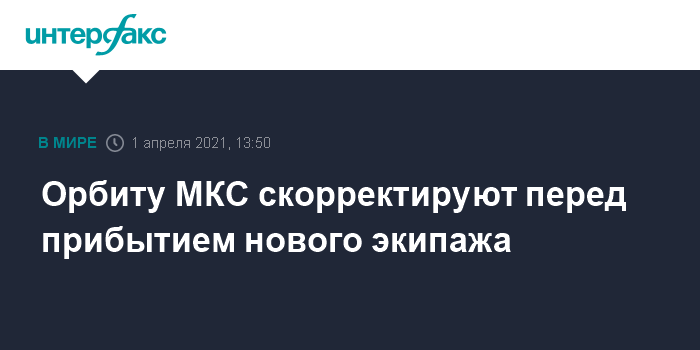 Москва. 1 апреля. INTERFAX.RU - Орбиту Международной космической станции (МКС) увеличат 2 апреля на 360 метров перед прибытием экипажа корабля "Союз МС-18", который отправится к станции 9 апреля, сообщили в "Роскосмосе" в четверг.