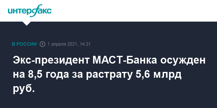 Экс-президент МАСТ-Банка осужден на 8,5 года за растрату 5,6 млрд руб.