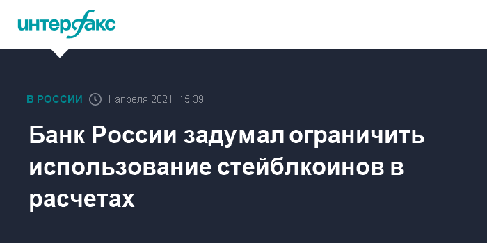 Москва. 1 апреля. INTERFAX.RU - Банк России думает об ограничении использования стейблкоинов в расчетах по аналогии с необеспеченными криптовалютами, заявил директор департамента финансовых технологий ЦБ Иван Зимин на расширенном заседании комиссии РСПП по банкам и банковской деятельности.