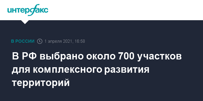 Москва. 1 апреля. INTERFAX.RU - Около 700 земельных участков на территории России могут быть задействованы для проектов комплексного развития территорий (КРТ), сообщила в четверг директор департамента жилищной политики Минстроя РФ Ольга Корниенко.