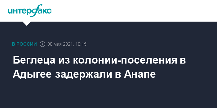 Москва. 30 мая. INTERFAX.RU - Заключенный, сбежавший 28 мая из колонии-поселения в Майкопе (Адыгея) задержан в Анапе (Краснодарский край), сообщает в воскресенье пресс-служба УФСИН региона.