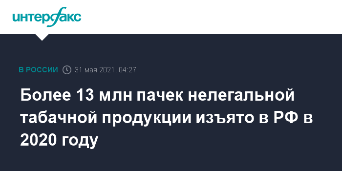 Москва. 31 мая. INTERFAX.RU - Общее количество изъятой из оборота нелегальной табачной продукции на территории России в 2020 году составило 13 327 623 пачек, сообщается на сайте Роспотребнадзора.