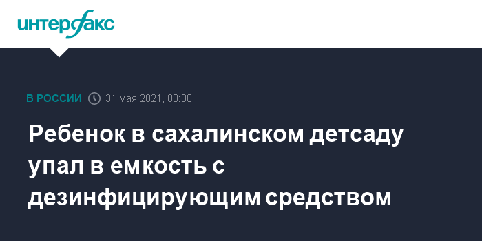Москва. 31 мая. INTERFAX.RU - Полуторагодовалый ребенок упал в емкость с дезинфицирующим средством в детском саду поселка Ноглики на севере Сахалина утром в понедельник, сообщает пресс-служба правительства региона.