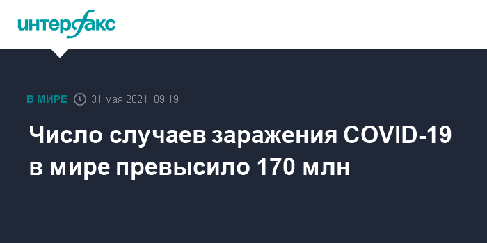 Москва. 31 мая. INTERFAX.RU - Число зарегистрированных случаев заражения COVID-19 в мире на утро понедельника составило 170 353 921, сообщил американский университет Джонса Хопкинса.