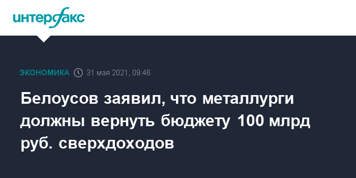 Белоусов заявил, что металлурги должны вернуть бюджету 100 млрд руб. сверхдоходов