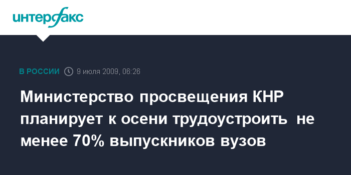 Пекин. 9 июля. ИНТЕРФАКС-КИТАЙ - В соответствии с планами министерства просвещения КНР, к 1 сентября будут обеспечены работой около 70% выпускников вузов 2009 года, заявил заместитель начальника отдела высшего образования министерства Чжан Хаоминь.