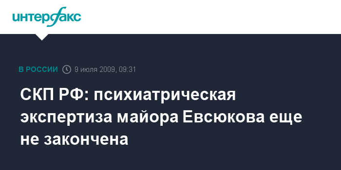 Москва. 9 июля. INTERFAX.RU - В Следственном комитете при прокуратуре РФ не подтвердили информацию о завершении психиатрической экспертизы в отношении майора милиции Дениса Евсюкова, устроившего бойню на юге Москвы. Как заявил в четверг "Интерфаксу" сотрудник пресс-службы СКП РФ, психиатрическая экспертиза продолжается, результатов пока нет.
