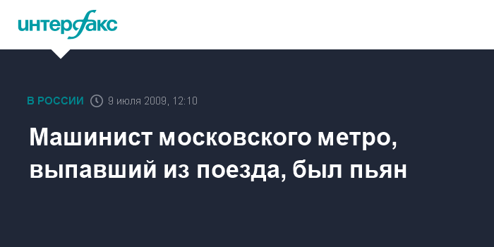 Москва. 9 июля. INTERFAX.RU - Машинист московского метрополитена, который ночью выпал из вагона поезда на перегоне между станциями "Славянский бульвар" и "Кунцевская", был нетрезв и не при исполнении служебных обязанностей, сообщили "Интерфаксу" в четверг в пресс-службе метрополитена. "Около нуля часов в ночь с 7 на 8 июля машинист метро со своими друзьями, также находившимися в состоянии алкогольного опьянения, на станции "Славянский бульвар" сели в последний вагон поезда. Когда состав находился в тоннеле по направлению к "Кунцевской", машинист открыл ключом кабину состава", - сообщили в пресс-службе метрополитена. В ней рассказали, что затем машинист открыл боковую дверь кабины, выпал на рельсы и погиб. Машинист следующего поезда заметил тело человека в тоннеле и сообщил об этом диспетчеру. Собеседник агентства добавил, что погибший сотрудник метрополитена нарушил должностные инструкции и не сдал ключ от кабины поезда.