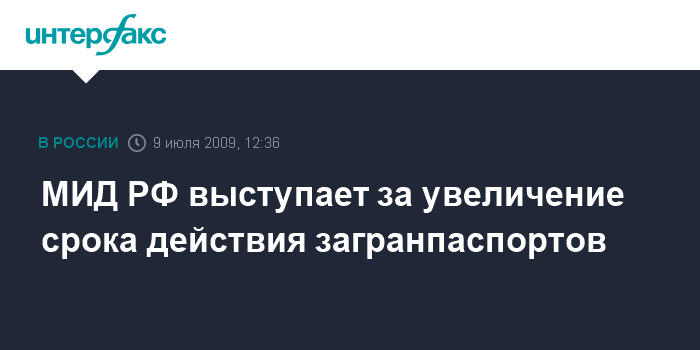 Москва. 9 июля. INTERFAX.RU - В МИД РФ рассчитывают на положительное решение вопроса об увеличении срока действия российского заграничного паспорта с пяти до десяти лет.