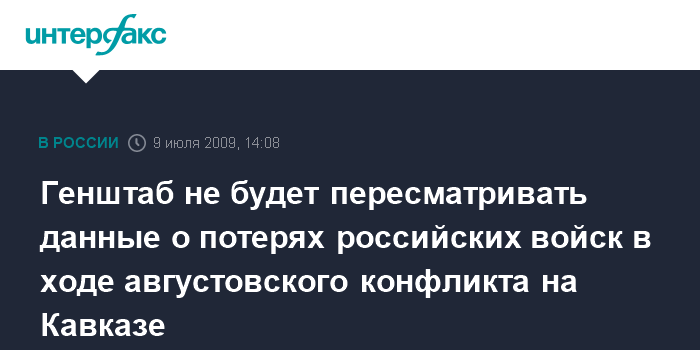Москва. 9 июля. INTERFAX.RU – В российском Генштабе заявляют, что не намерены пересматривать данные о потерях российских войск в ходе операции по принуждению Грузии к миру.