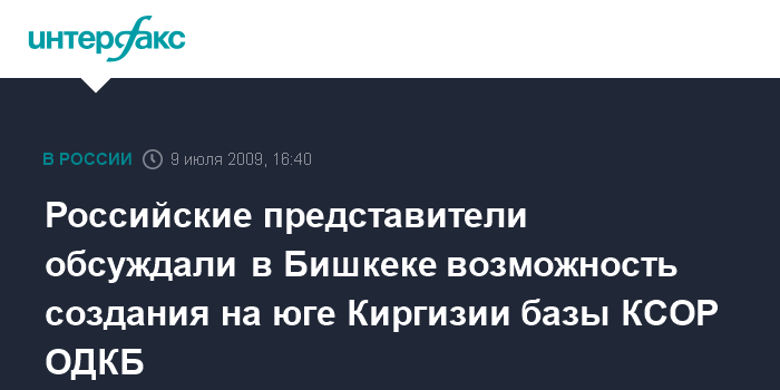 Москва. 9 июля. INTERFAX.RU - На переговорах, которые провели 7 июля в Бишкеке члены российской правительственной делегации, речь шла о возможности развертывания на юге Киргизии базы для размещения Коллективных сил оперативного развертывания ОДКБ.