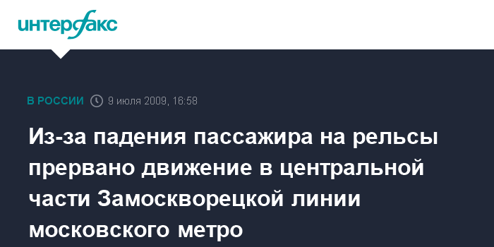 Москва. 9 июля. INTERFAX.RU - Из-за падения человека в четверг на пути Замоскворецкой линии московского метрополитена не осуществляется движение поездов на двух перегонах линии, сообщили "Интерфаксу" в пресс-службе метро.