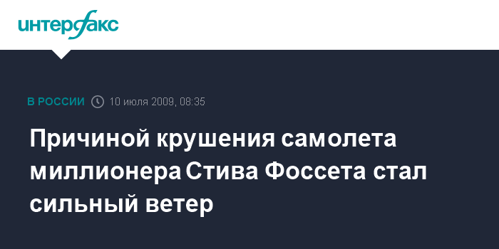 Москва. 9 июля. INTERFAX.RU – Сильный ветер и нисходящие потоки воздуха, скорее всего, стали причиной авиакатастрофы, в которой в сентябре 2007 года погиб американский миллионер-путешественник Стив Фоссет, сообщает британская телерадиокорпорация Би-би-си со ссылкой на результаты расследования Национального комитета безопасности перевозок США.