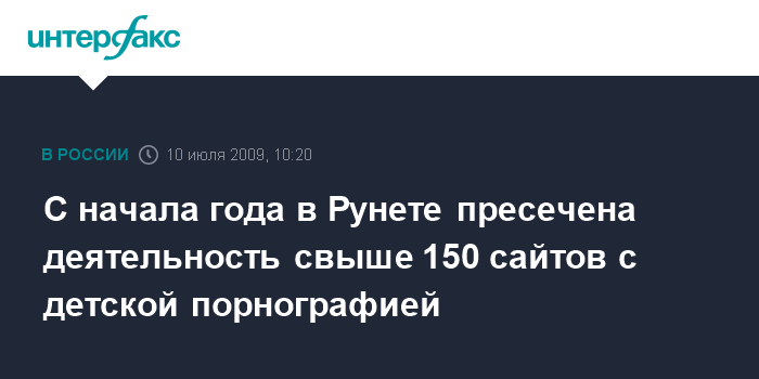 Москва. 9 июля. INTERFAX.RU – Российские киберполицейские в текущем году заблокировали уже более 150 интернет-ресурсов с детской порнографией, сообщила официальный представитель Управления "К" МВД РФ Ирина Зубарева.