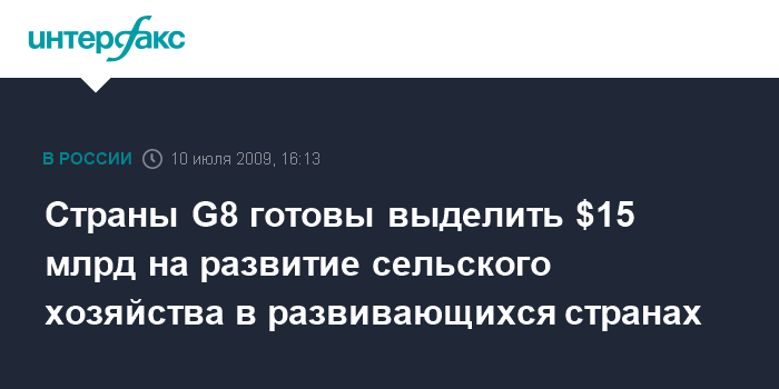 Москва. 10 июля. INTERFAX.RU - Лидеры стран "восьмерки" по итогам саммита в Аквиле заявили о готовности выделить порядка 15 млрд долларов на помощь в развитии сельского хозяйства в развивающихся странах. BBC сообщает, что эти деньги планируется выделить в течение трех лет.