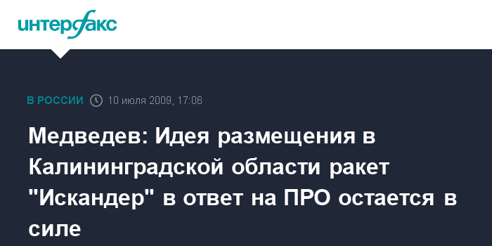 Москва. 10 июля. INTERFAX.RU - Идея развертывания ракетного комплекса "Искандер" в Калининградской области в ответ на американскую ПРО в Европе остается в силе, заявил президент РФ Дмитрий Медведев. "Если мы не сможем договориться по этим вопросам (по проблеме ПРО - ИФ), последствия вам известны. Никто пока ничего другого не предложил. И то, о чем я говорил во время обращения с Посланием к Федеральному собранию РФ, эта идея мною не отозвана", - заявил Медведев в Аквиле на пресс-конференции по итогам G8.