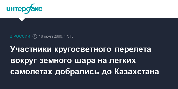 Москва. 10 июля. INTERFAX.RU - В казахстанский город Атырау в пятницу на 11-ти частных самолетах прилетели участники международного кругосветного перелета, сообщает корреспондент агентства "Интерфакс-Казахстан".
