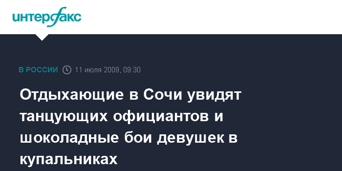 Сочи. 11 июля. ИНТЕРФАКС-ЮГ - Организаторы развлечений и отдыха Сочи готовят на весь сезон развлекательную программу для гостей и жителей курорта с танцующими официантками и девушками, дерущимися шоколадом.
