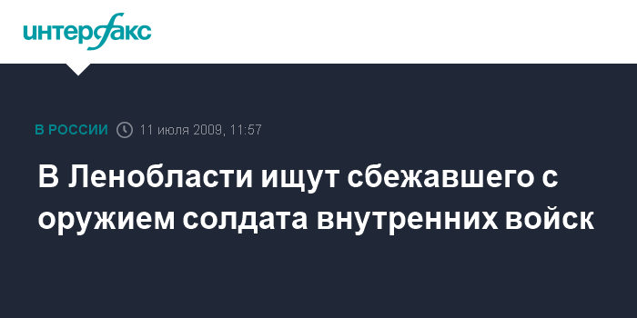 Москва. 11 июля. INTERFAX.RU - В Ленинградской области продолжаются поиски вооруженного солдата Внутренних войск МВД РФ, самовольно покинувшего воинскую часть в Ломоносовском районе Ленинградской области.