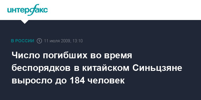 Москва. 11 июля. INTERFAX.RU - Число жертв событий 5 июля в столице Синьцзян-Уйгурского автономного района КНР (СУАР) городе Урумчи увеличилось до 184 человек, сообщил в субботу официальный представитель правительства СУАР Ли Чуньян.