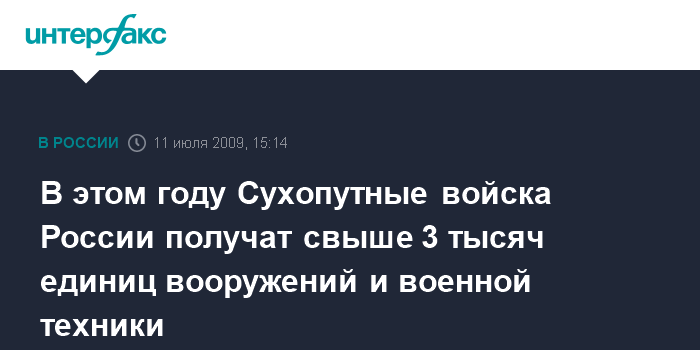 Москва. 11 июля. INTERFAX.RU - Более трех тысяч единиц вооружений и военной техники поступит в сухопутные войска России в 2009 году, заявил первый заместитель начальника Главного штаба Сухопутных войск РФ, генерал-лейтенант Сергей Антонов.