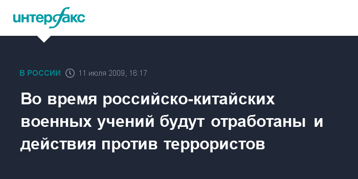 Москва. 11 июля. INTERFAX.RU - В ходе российско-китайских учений "Мирная миссия-2009" будут отработаны эпизоды действий войск применительно к контртеррористической операции, заявил первый заместитель начальника Главного штаба Сухопутных войск РФ, генерал-лейтенант Сергей Антонов.