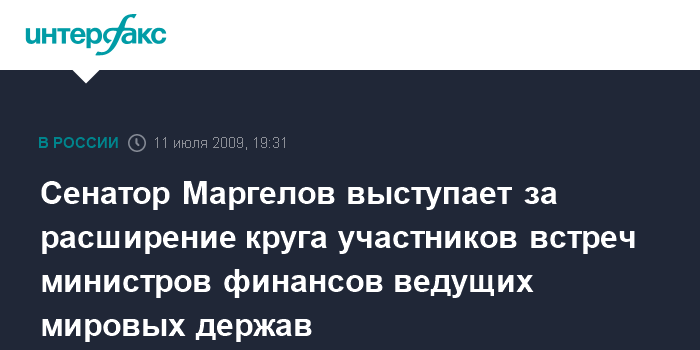 Сенатор Маргелов выступает за расширение круга участников встреч министров финансов ведущих мировых держав