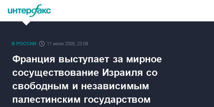 Франция, указал он, "видит единственным решением этого конфликта создание палестинцами свободного и независимого государства, которое будет мирно сосуществовать бок о бок с Израилем".