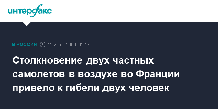 Москва. 12 июля. ИНТЕРФАКС - Два человека погибли при столкновении в субботу двух частных самолетов в департаменте Пюи-де-Дом во Франции, передает в воскресенье телекомпания "Вести".