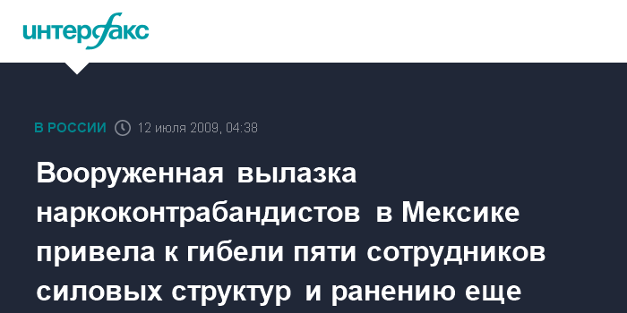 Мехико. 12 июля. ИНТЕРФАКС - Субботняя серия скоординированных вооруженных вылазок наркоконтрабандистов в семи городах Мексики привела к гибели трех полицейских офицеров и двух солдат. Еще шесть полицейских получили ранения.
