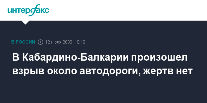 Москва. 12 июля. INTERFAX.RU - В Кабардино-Балкарии утром в воскресенье произошел взрыв неустановленного устройства на автодороге "Прохладный - Азау".