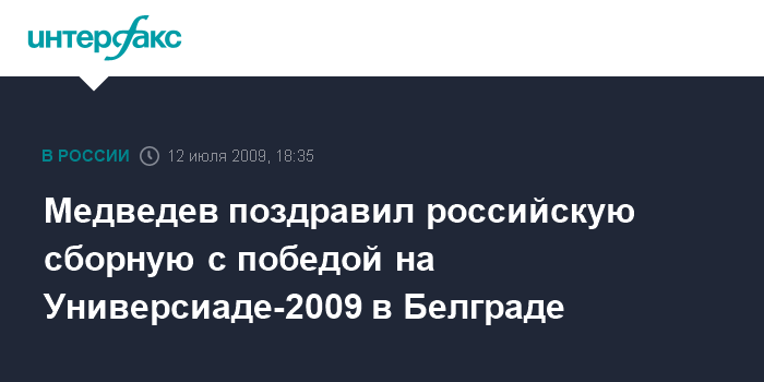 Москва. 12 июля. INTERFAX.RU - Президент России Дмитрий Медведев поздравил российскую студенческую сборную с блестящим выступлением на XXV Всемирной летней Универсиаде-2009 в Белграде.