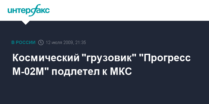 Москва. 12 июля. ИНТЕРФАКС-АВН - Российский грузовой космический корабль "Прогресс М-02М" провел тестовое сближение с Международной космической станцией (МКС) для проверки работоспособности нового причала, расположенного на служебном модуле "Звезда".