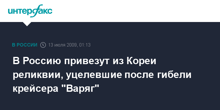 "13 июля из Сеула возвращается официальная делегация во главе с руководителем Росохранкультуры Александром Кибовским, с которой в Россию для проведения передвижной выставки прибывают реликвии, связанные с подвигом крейсера "Варяг" и канонерской лодки "Кореец" во время Русско- японской войны", - сообщили "Интерфаксу" в ведомстве.