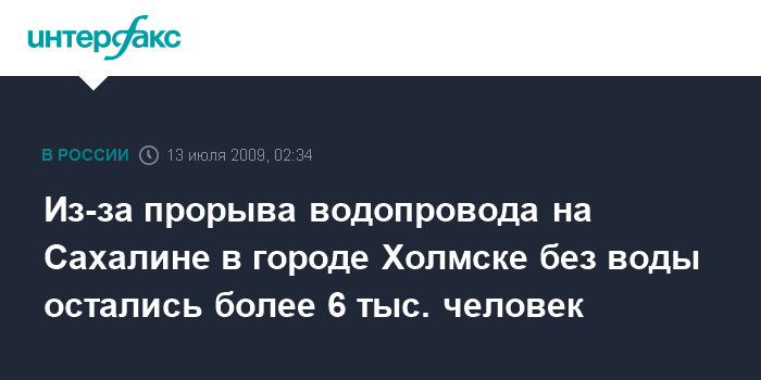 Южно-Сахалинск. 13 июля. ИНТЕРФАКС-ДАЛЬНИЙ ВОСТОК - В результате проседания грунта более 6 тыс. жителей города Холмска острова Сахалин остались без водоснабжения.