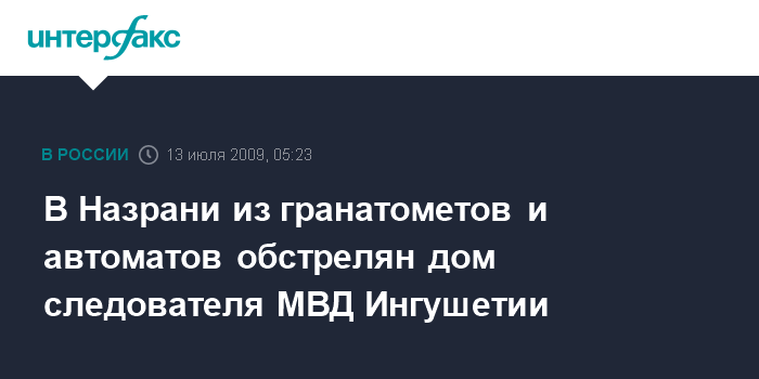 Назрань. 13 июля. ИНТЕРФАКС-ЮГ - В муниципальном округе Альтиево в Назрани неизвестные обстреляли частное домовладение, где проживает следователь МВД Ингушетии.