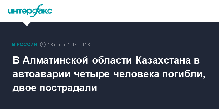 Алма-Ата. 13 июля. ИНТЕРФАКС-КАЗАХСТАН - Четыре человека погибли, двое получили различные травмы в результате дорожно-транспортного происшествия в Алматинской области Казахстана.