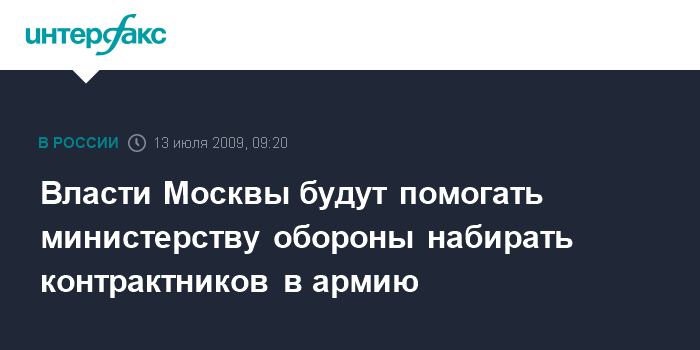 Москва. 13 июля. INTERFAX.RU - Столичные власти будут оказывать поддержку военкомату Москвы в вопросах набора контрактников в ряды Вооруженных сил, сообщили "Интерфаксу" в городской администрации в понедельник.