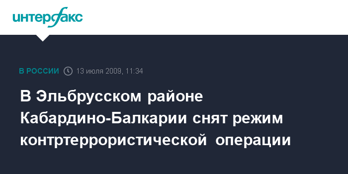 Москва. 13 июля. INTERFAX.RU - В Эльбрусском районе Кабардино-Балкарии с 6:00 мск понедельника отменили режим контртеррористической операции (КТО), введенный 30 июня.