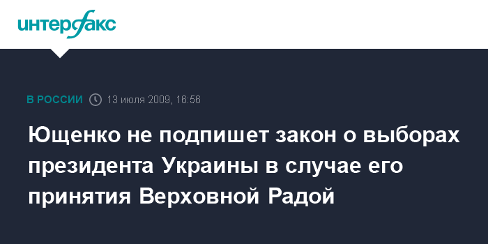 Москва. 13 июля. INTERFAX.RU - Президент Украины Виктор Ющенко не подпишет закон о выборах президента, если он будет нарушать права человека, сообщила пресс-секретарь главы государства Ирина Ванникова. Говоря об оценке Ющенко изменений в закон о выборах президента, которые парламент принял в первом чтении, она отметила, что данный документ - "политическое мошенничество, оформленное правовой оболочкой". По ее словам, за юридической казуистикой в этом документе спрятаны попытки лишить граждан конституционного права выбора.