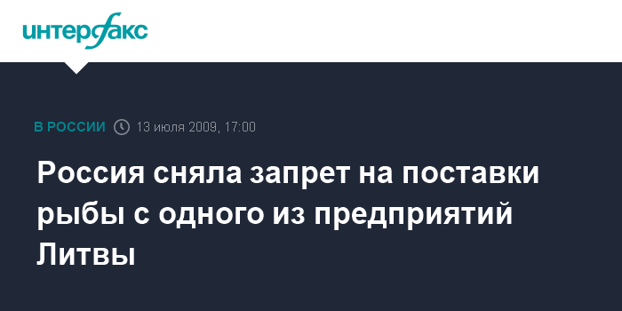 Москва. 13 июля. INTERFAX.RU - Россельхознадзор с 13 июля снял запрет на поставки рыбы, рыбо- и морепродуктов с литовского предприятия LT 68-08 EB, сообщила служба. Запрет был введен в апреле этого года из-за нарушений российских ветеринарных требований.