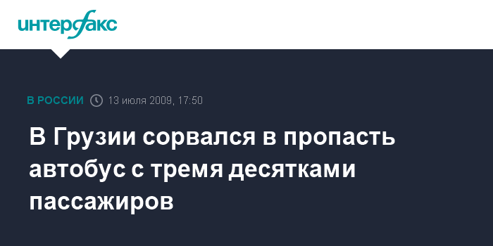 Москва. 13 июля. INTERFAX.RU - Автобус, перевозивший около 30 пассажиров в возрасте от 15 до 23 лет, направлявшихся в летний лагерь отдыха "Патриот", сорвался с 40-метровой высоты в пропасть в районе перевала Накирала в центральной Грузии. Как сообщил журналистам губернатор региона Имерети Михаил Чоговадзе, по предварительным данным, погиб один человек, все остальные пассажиры получили травмы различной степени. По его словам, к месту инцидента уже прибыли бригады спасателей и скорой помощи.