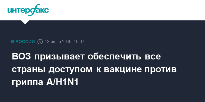 Женева. 13 июля. INTERFAX.RU - Все страны мира должны получить вакцину, чтобы остановить распространение вируса гриппа A/H1N1, заявила в понедельник представительница Всемирной организации здравоохранения Мари-Поль Киени.