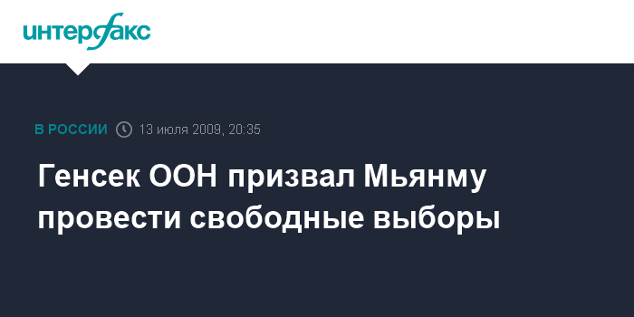 Нью-Йорк (ООН). 13 июля. INTERFAX.RU - Генеральный секретарь ООН Пан Ги Мун заявил в понедельник, что военное руководство Мьянмы (Бирмы) должно сдержать обещание и провести в 2010 году свободные выборы.