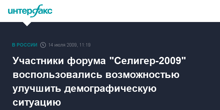 Москва. 14 июля. INTERFAX.RU - Во время сильнейшего ливня на форуме "Селигер-2009" его участники улучшали демографическую ситуацию в России, заявляют организаторы молодежного форума.